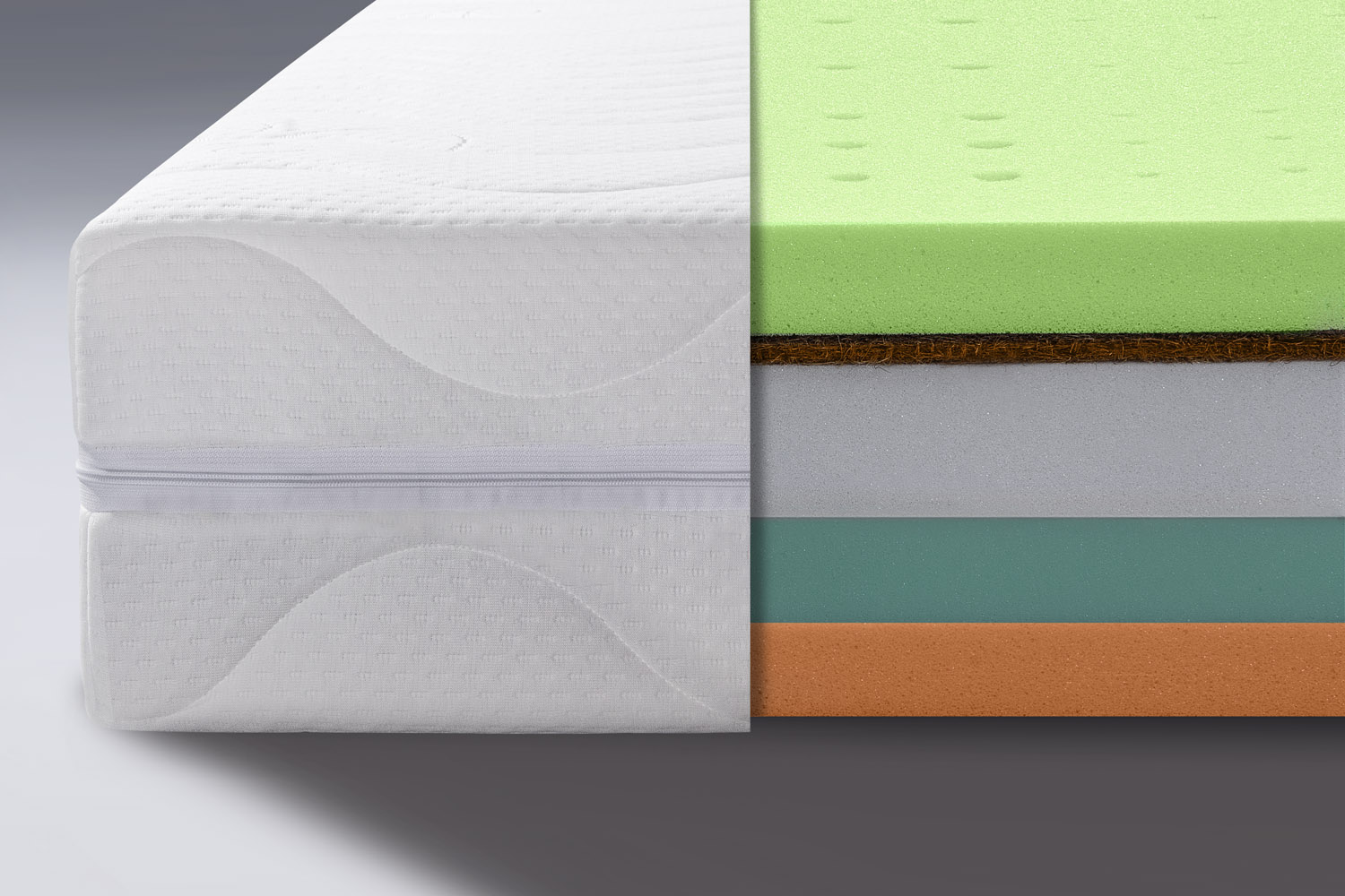 Jadro matraca tvorí kvalitná PUR pena s hustotou 28 kg/m³, ktorá zabezpečuje pevnosť, stabilitu a odolnosť celej konštrukcie. Mäkkšiu stranu tvorí HR pena (studená pena) s hustotou 38 kg/m³, známa svojou výbornou priedušnosťou a schopnosťou prispôsobiť sa telu.