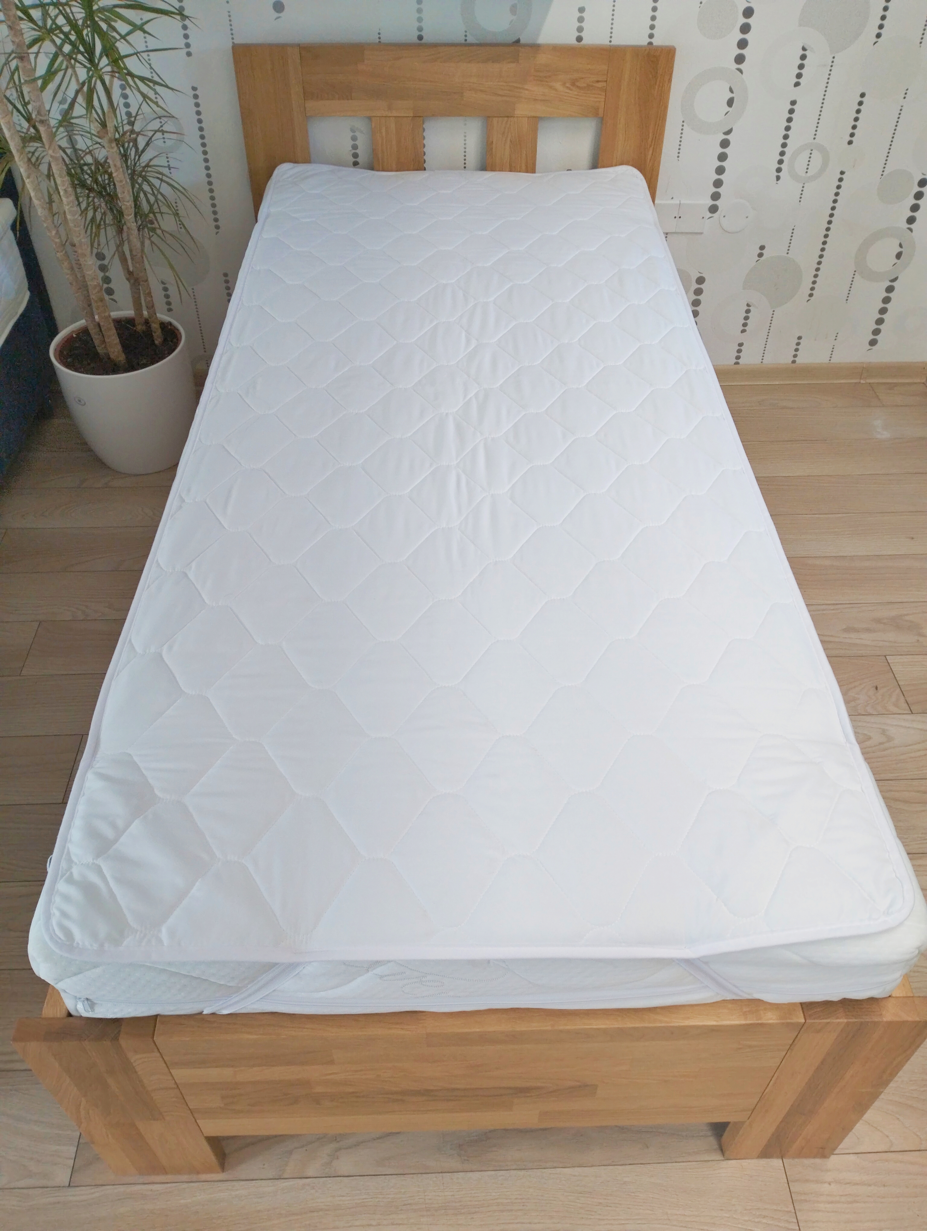 90% našich zákaznikov si rovno k matracom automaticky hneď doobjednáva antibakteriálny protiroztočový chránič matraca, ktorý šijeme z moderného trojvrstvového mikrovlákna. Chránič sa dáva navrch matraca, po rohoch má napínacie pásy a upne sa o roh matraca a je na pevno, nešmýka sa po povrchu matraca. Chráni matrac pred roztočami, baktériami, vlhkosťou, plesňami, čím predlžujeme životnosť matraca a zvyšujeme hygienu lôžka, pretože mikrovlákno je taká textília, ktorá dokáže absorbovať pot, špinu, baktérie, odumretú pokožku, vlasy, lupiny. Jednoduchá údržba chrániča, perieme na 40°C, podľa potreby, dvakrát do mesiaca. Chránič nie je investícia na pár dní alebo na týždeň, ale máte to na roky. Určite je to vec na nezaplatenie.