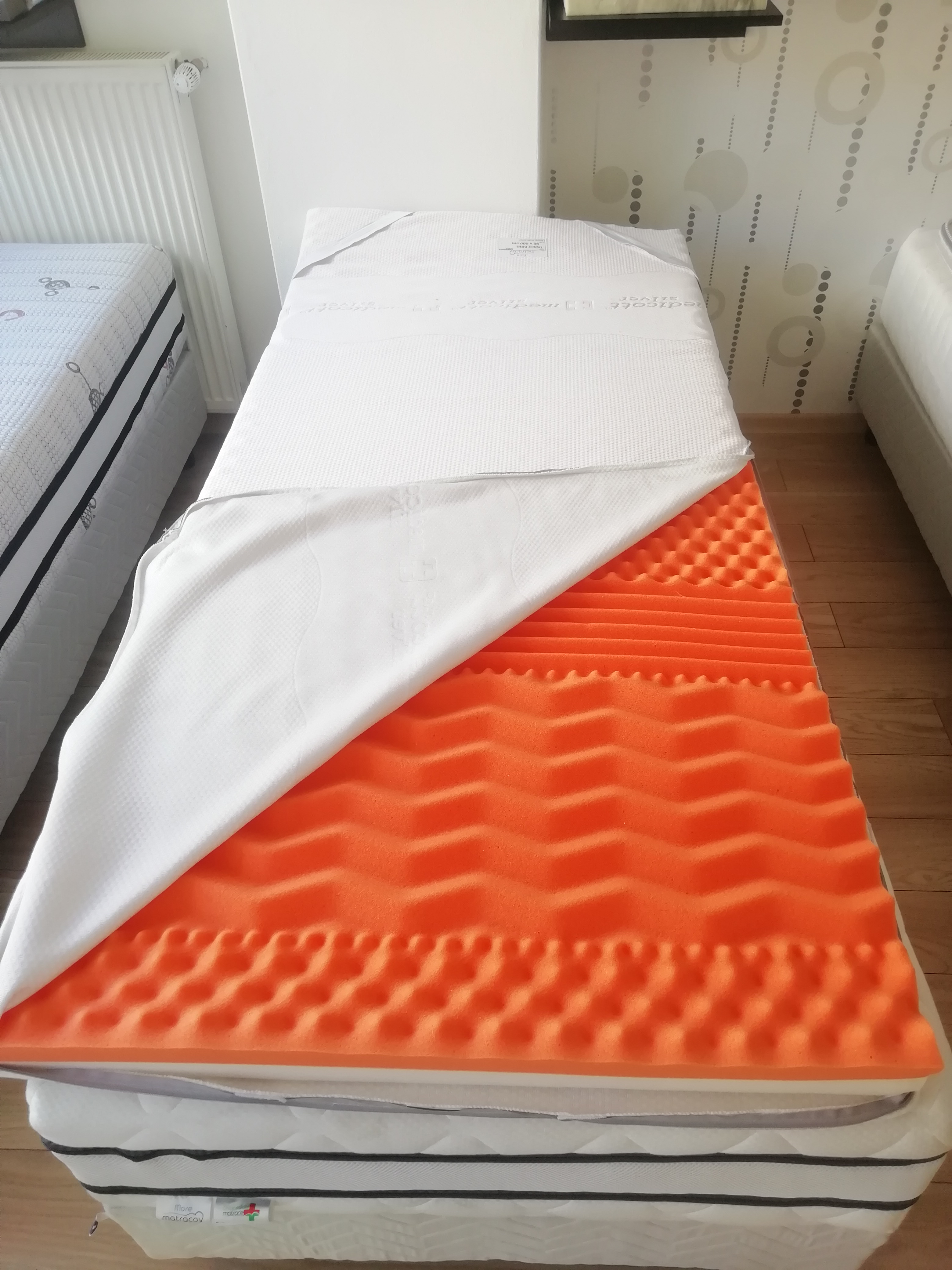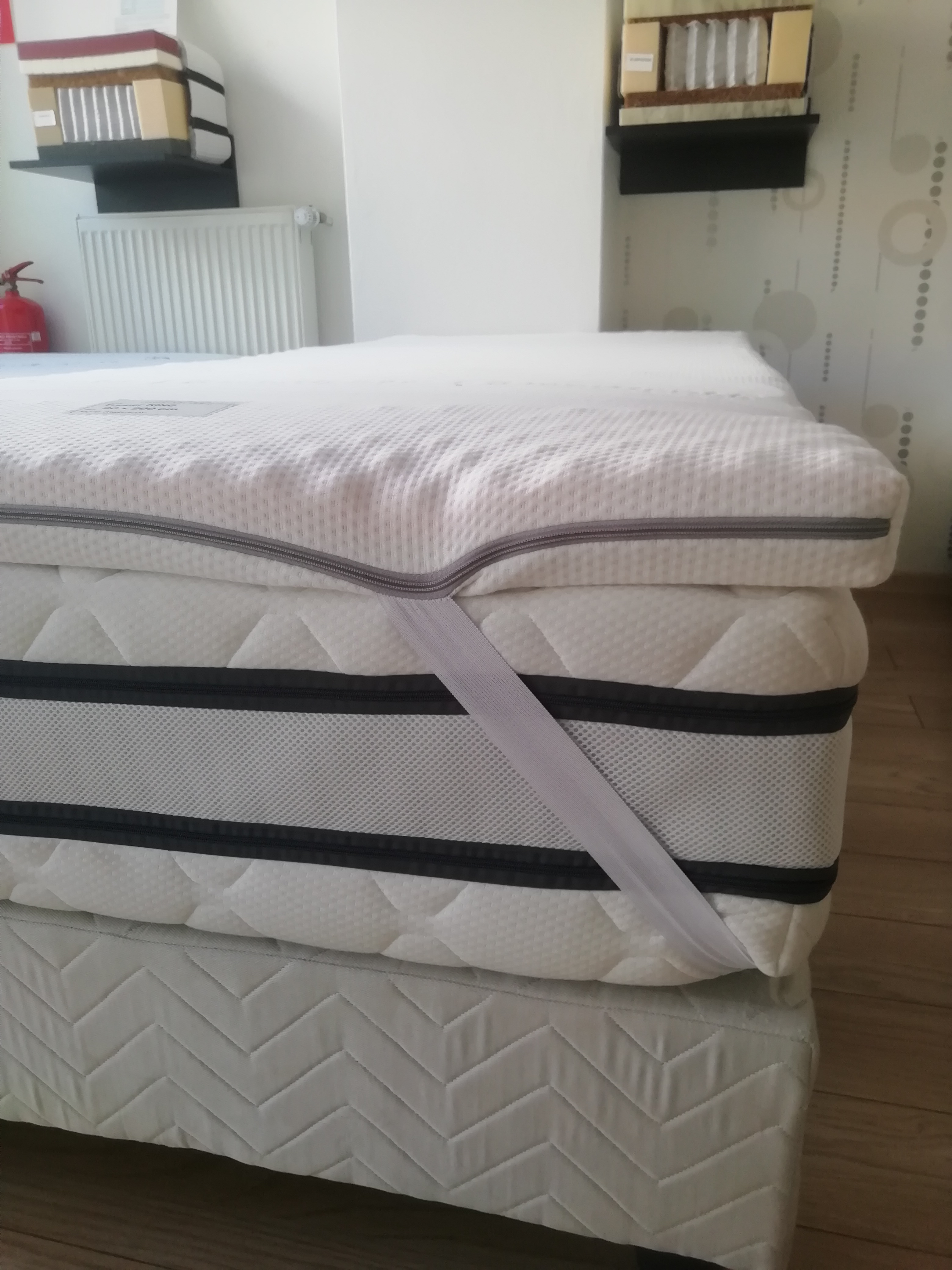 Určite neprehliadnete aj široké upínacie pásy po bokoch, vďaka ktorým sa topper jednoducho upne o spodný matrac a nešmýka sa tak po povrchu.Pozrite obrázky. Vrchné matrace vyrábame aj v atypických rozmeroch a v prípade záujmu o atyp nas kontaktujte telefonický alebo emailom.